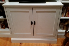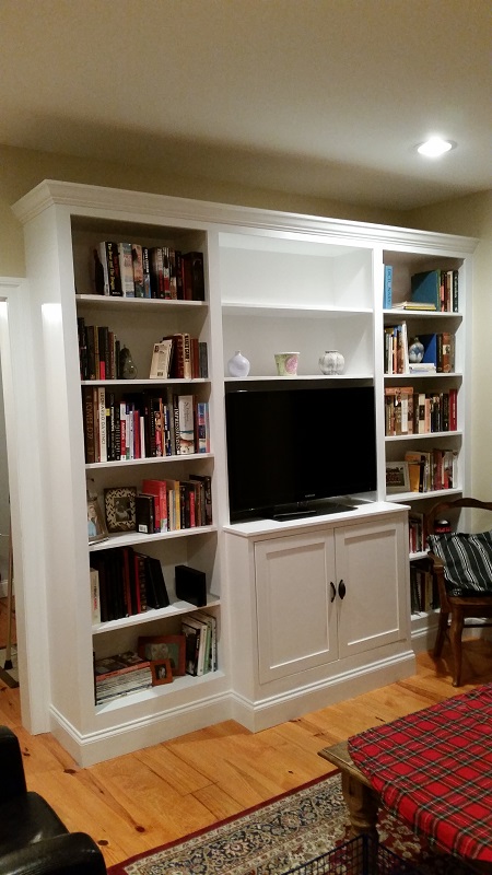 This unit is 8 feet tall and over 8 feet wide and consists of 3 sections. The middle one has shelves on top, holds a TV in the middle and has a storage cabinet below for audio/video equipment. It’s finished with crown and baseboard moldings to tie it in with the trim in the room.