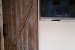 This barn slider door and faux wooden archway were created to add the finishing touches to a complete kitchen remodel. The door hides an attached laundry room and reveals a wall-mounted TV when closed. The archway is designed to mimic the look of large framing support beams. Both were made from white oak and finished with a multi-step staining and cerusing process that matches the kitchen island and range hood cabinets.